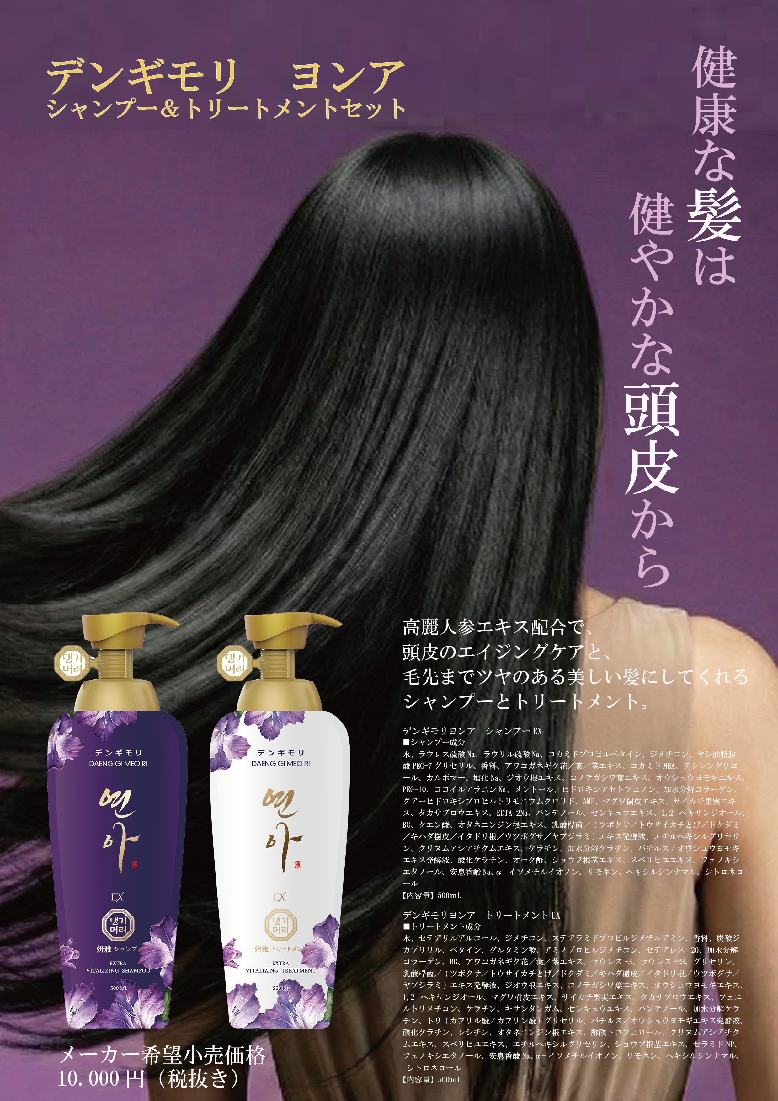 健康な髪は 健やかな頭皮から 高麗人参エキス配合で、頭皮のエイジングケアと、 毛先までツヤのある美しい髪にしてくれる シャンプーとトリートメント メーカー希望小売価格 10,000円(税抜き) 商品名 デンギモリヨンア シャンプーEX 内容量 500ml 商品名 デンギモリヨンア トリートメントEX 内容量 500ml