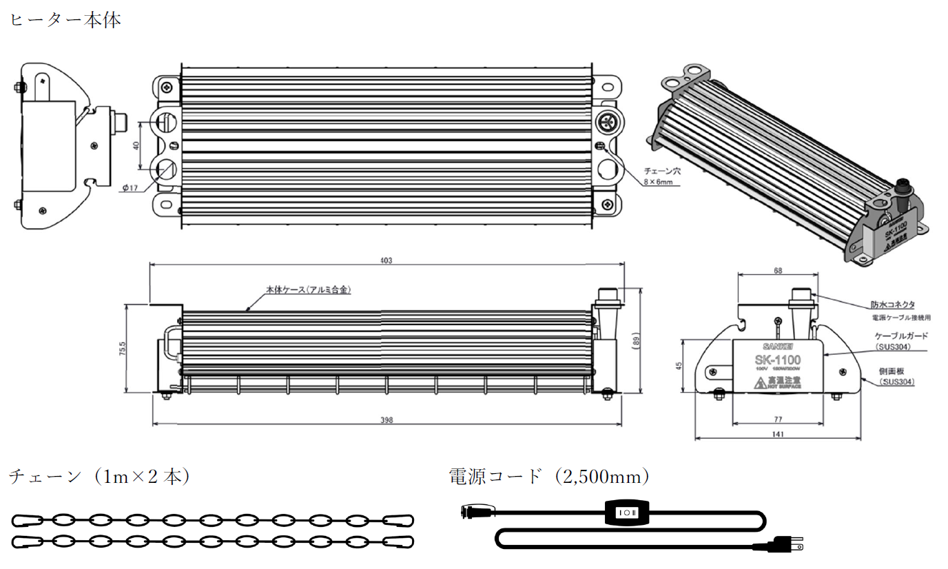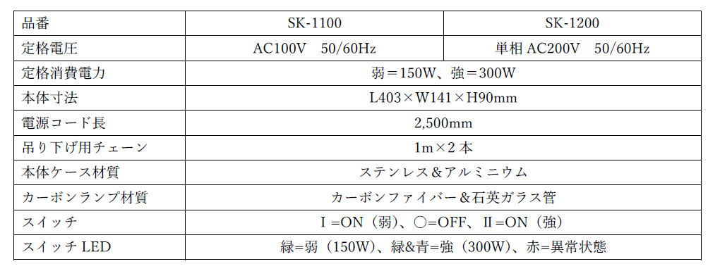 本体:SK-1100(100V) 電力:300W 本体から床までの距離:60cm