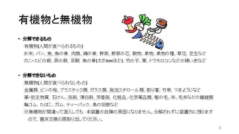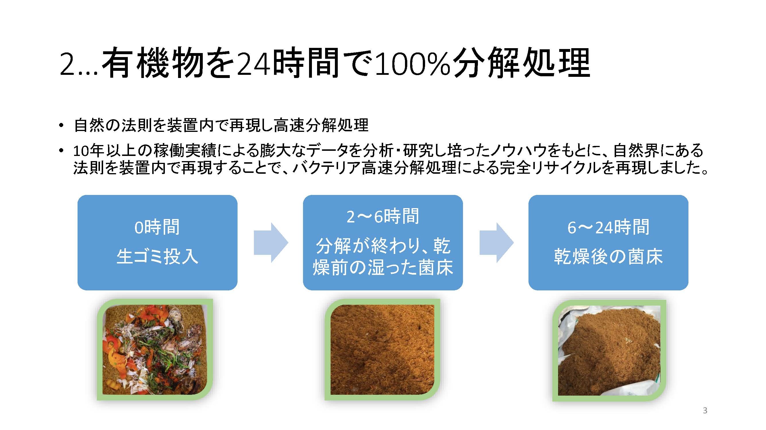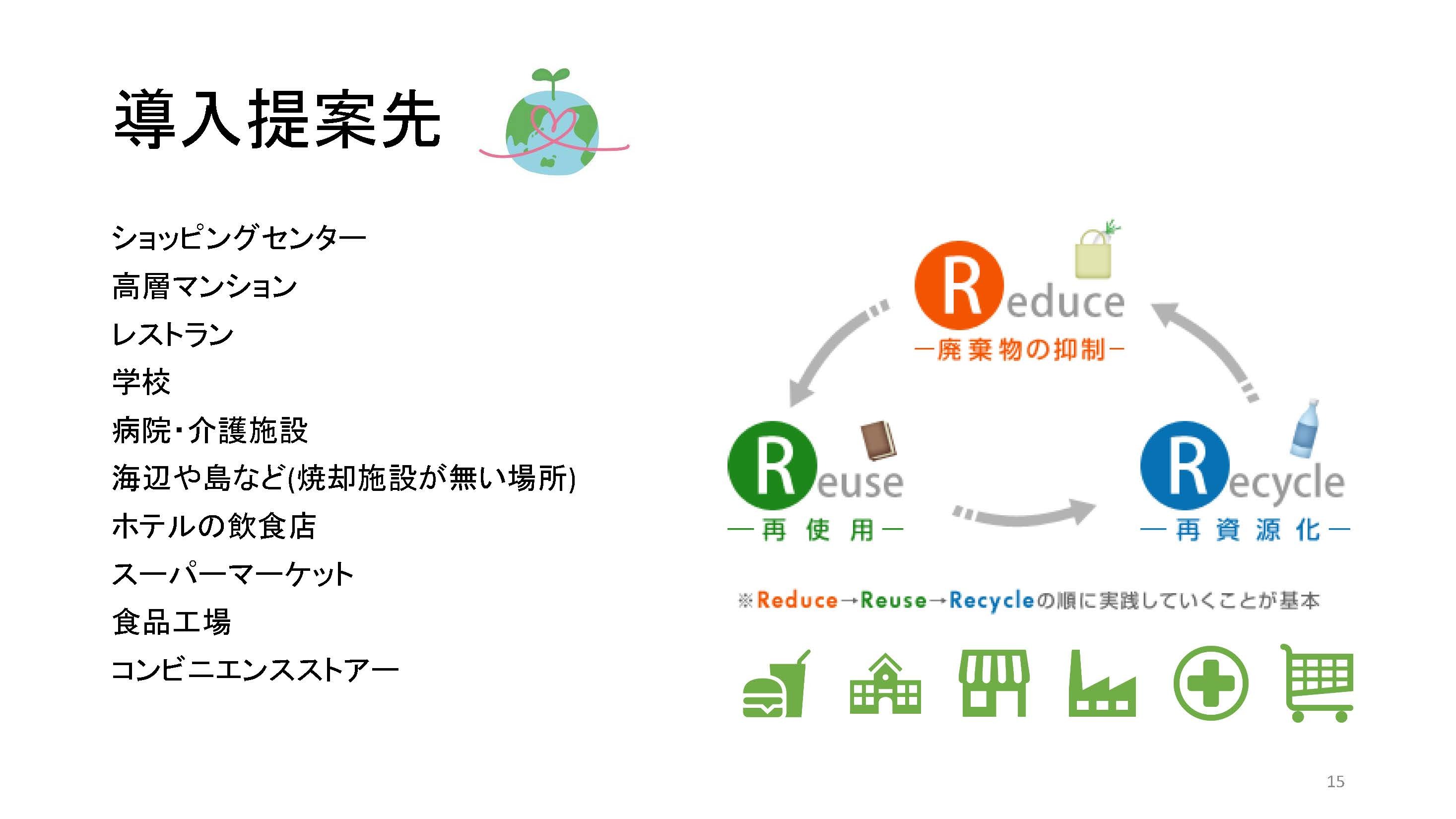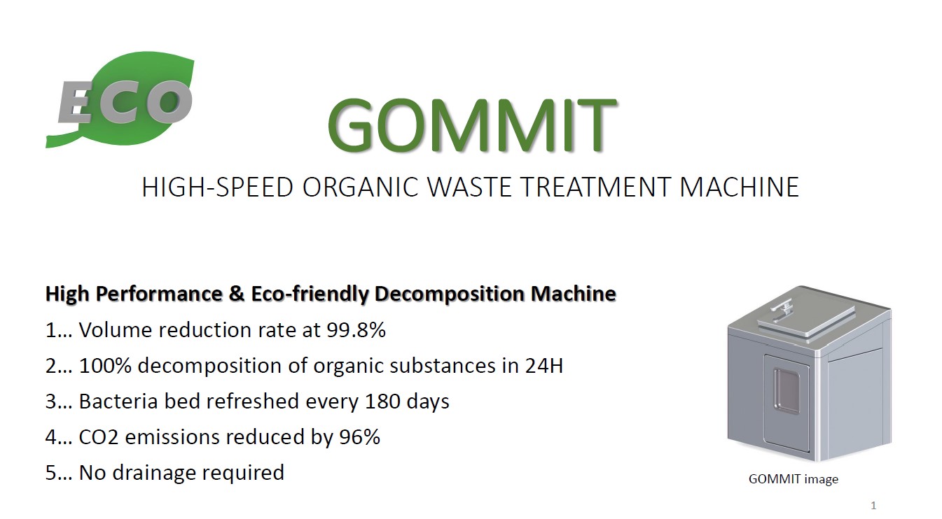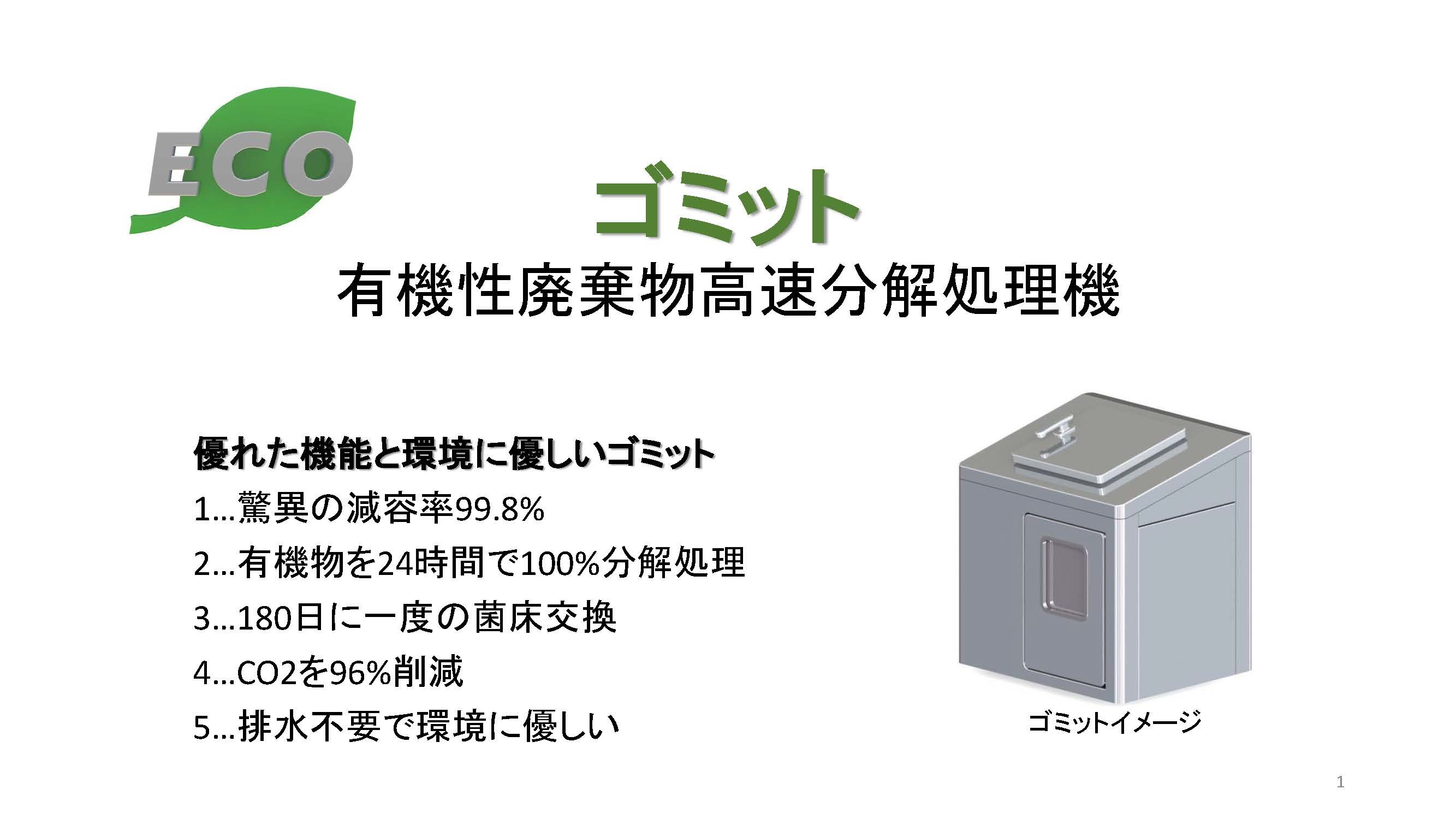 有機性廃棄物高速分解処理機 ゴミットは、日々大量に発生する生ゴミを有効に活用するためのひとつの提案です。簡単な作業と少しのコストで、生ゴミを自然に返して植物の栄養にします。お店や家庭から生まれて捨てられていく生ゴミを、バイオの助けを借りてエネルギーに変える。 生活環境をやさしく改善するのがゴミットの仕事です。