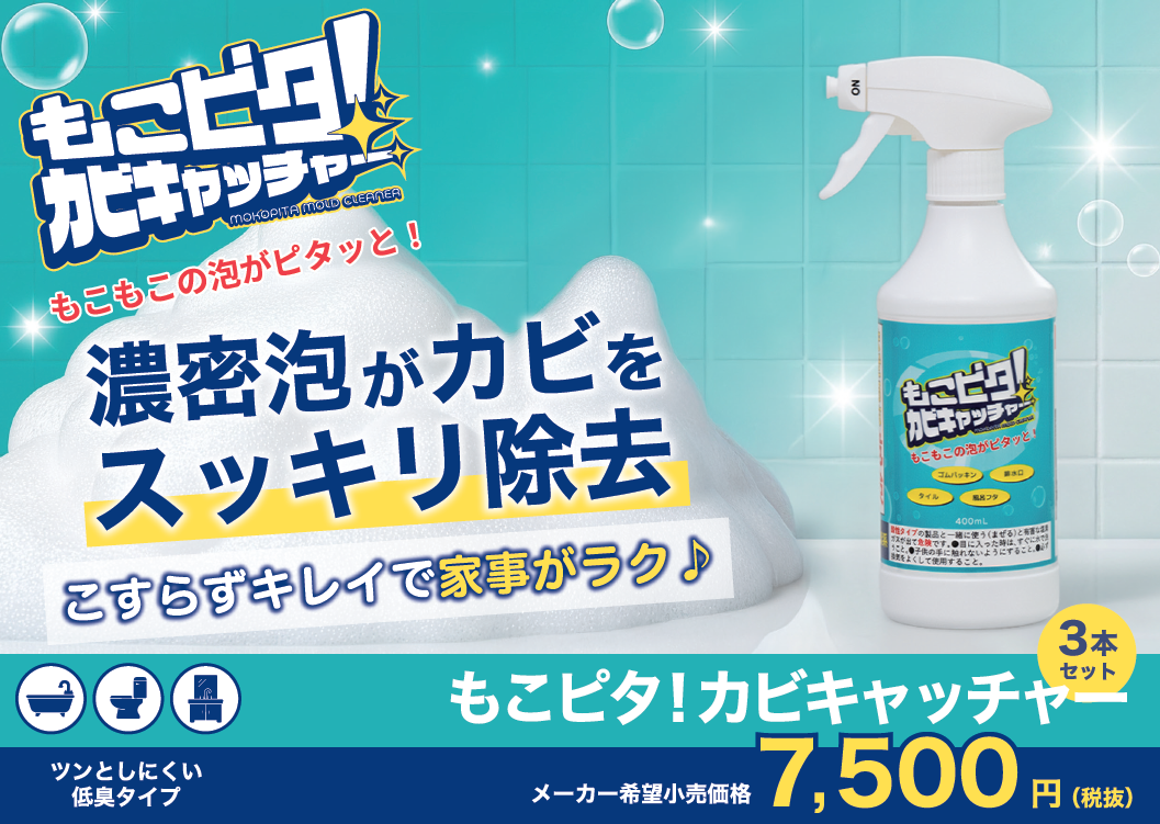 商品パンフレットは、以下からダウンロードしてください↓ パンフレット PDF メーカー希望小売価格 7,500円(税抜き) 商品名 もこピタ!カビキャッチャー 3本セット 名 称 屋内用カビ黒ずみ除去洗浄剤 液 性 アルカリ性 用 途 浴室(壁、タイル、ゴムパッキン)、キッチン、流し台、トイレ周り、小物類 成 分 次亜塩素酸塩、水酸化ナトリウム(0.8%)、界面活性剤(アルキルアミンオキシド)、泡調整剤 容 量 400ml